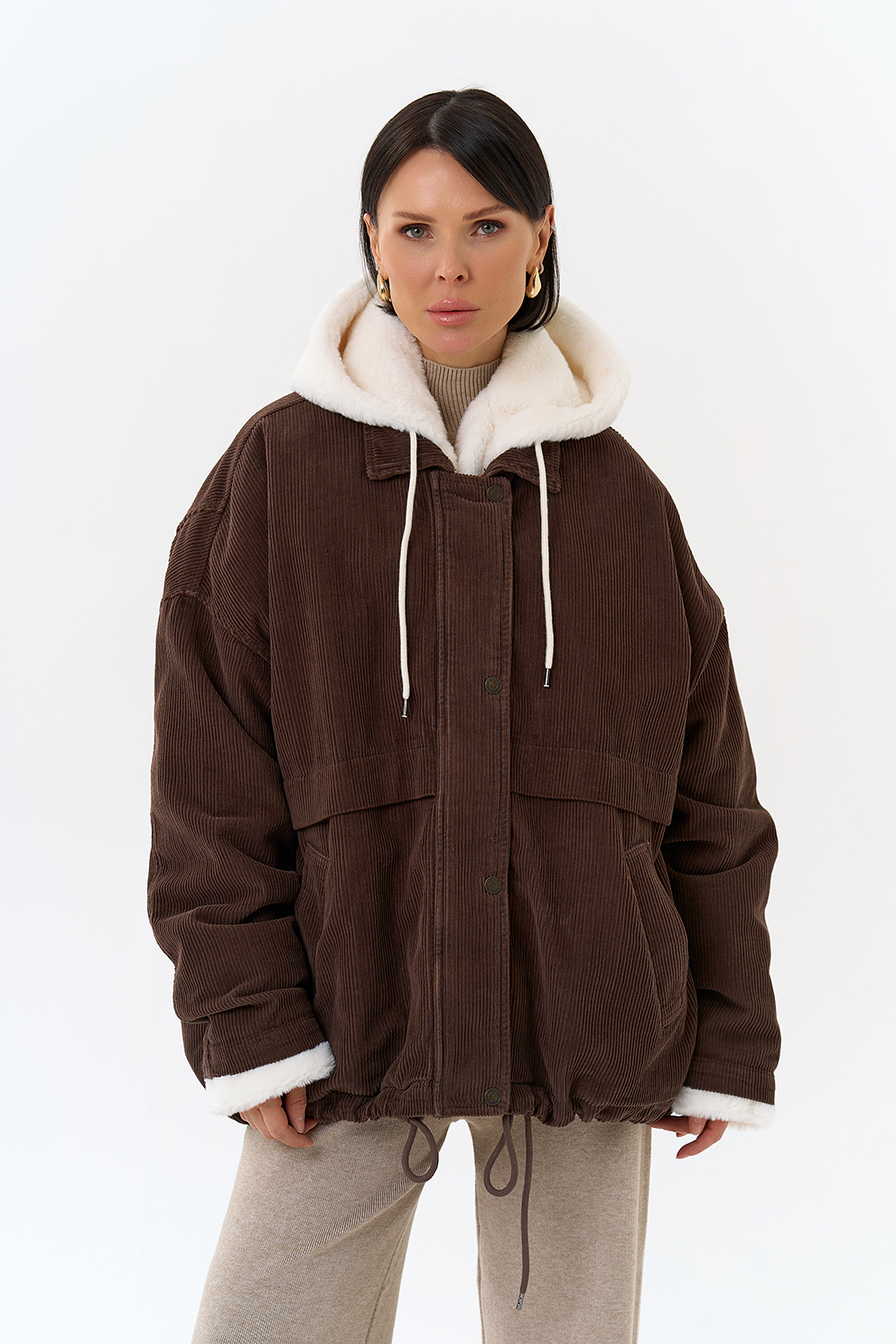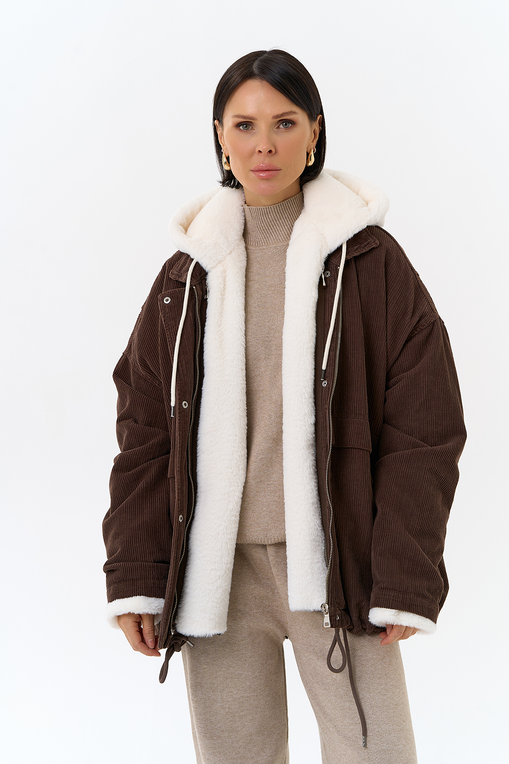 Крой воротника - съемный капюшон, отделка эко мех